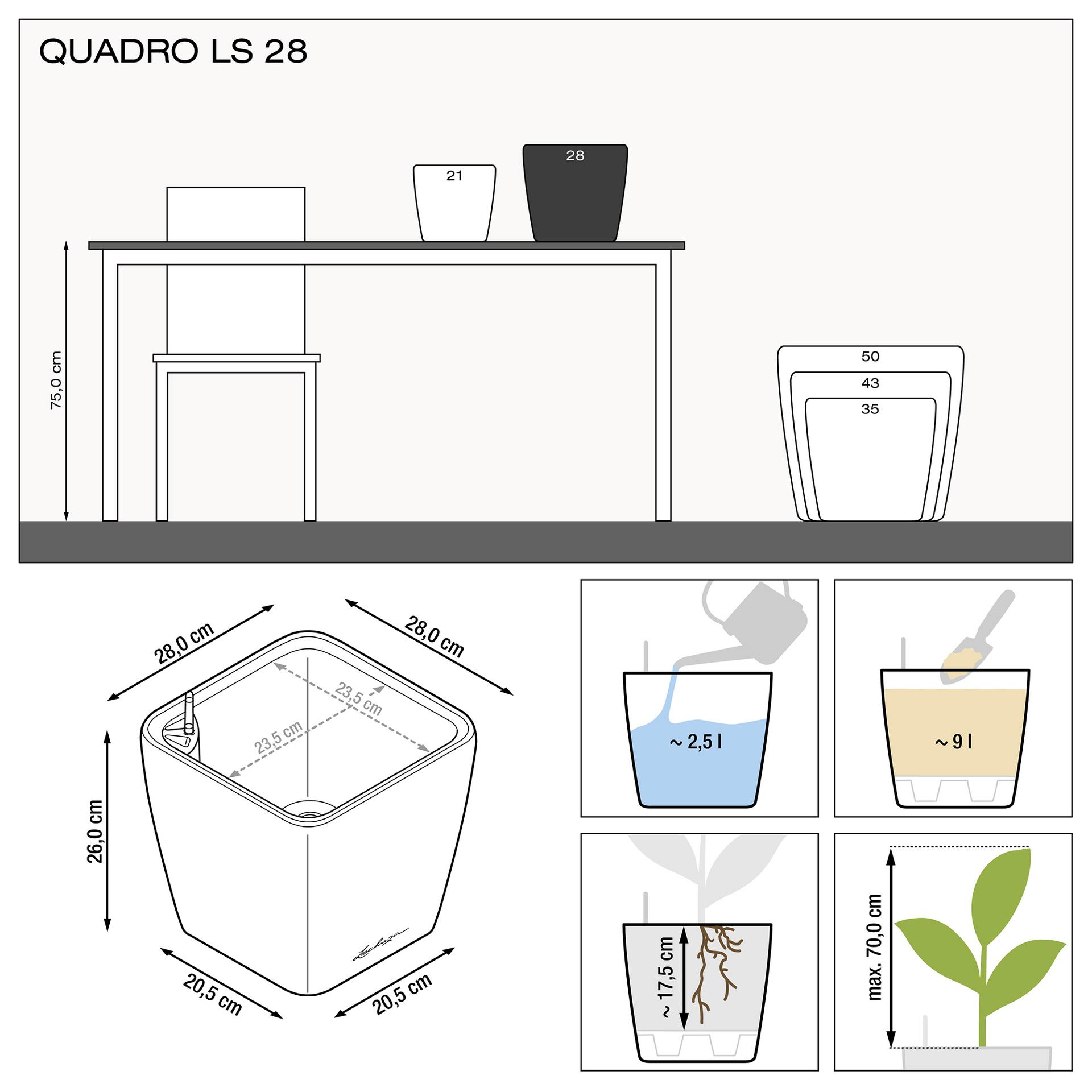 QUADRO LS captivates with its puristic design in five different sizes, which make numerous design ideas possible: as table decoration with changing plants in the QUADRO LS 21, the QUADRO LS 43 as a new home for the large golden fruit palm for your own Urban Jungle or the QUADRO LS 50 as greernery of a hotel lobby. With the QUADRO LS, there are no limits to the design possibilities: QUADRO 43 and 50 are also mobile when planted, thanks to additionally available roller coasters. Thanks to the patented, retractable handle frames, changing the plants and plant care is also a child's play.