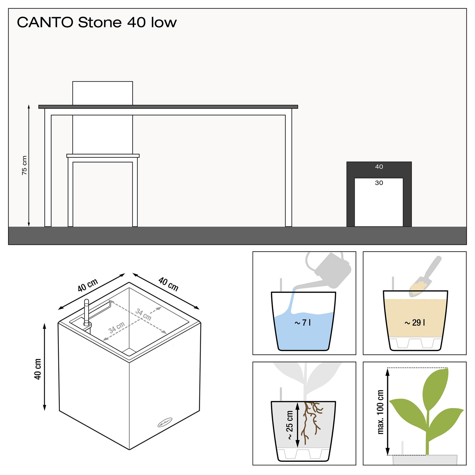 Iedereen die duidelijke lijnen waardeert, zal dol zijn op CANTO Stone. De ruwe natuursteenlook in drie kleuren vormt een prachtig contrast met de weelderige groene en kleurrijke bloemen. Dankzij dezelfde afmetingen kan de CANTO binnenbak eenvoudig worden verwisseld tussen de twee modellen, kubus en zuil. CANTO Stone is de winnaar van de Red Dot Award 2017, weerspiegelt kernelementen van de hedendaagse architectuur en zet planten op aantrekkelijke wijze in de kijker. Fijne vroege bloeiers, weelderige zomerbloemen, herfstarrangementen of winterbeplantingen - de plantenbakken met natuursteenlook bieden op elk moment van het jaar een sfeervol contrast met de planten. De bakken, die aanvoelen als ruwe, massieve steen, zijn gemaakt van hoogwaardig, weerbestendig kunststof en daardoor gemakkelijk te verplaatsen. En het LECHUZA-irrigatiesysteem zorgt zoals gewoonlijk voor een optimale watertoevoer naar de planten. Het verzorgen van planten kan niet eenvoudiger!
